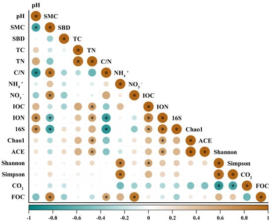 Correlation analysis of different utilization types of soil properties in natural forest soil (NS), healthy banana soil (HS), diseased banana soil (DS), and paddy soil (PS). SMC, soil moisture content; SBD, soil bulk density; TC, total carbon; TN, total nitrogen; IOC, insoluble organic carbon; ION, insoluble organic nitrogen; 16S, bacterial gene copy number; CO2, carbon dioxide emissions; FOC: FOC gene copy number; C/N: total organic carbon (TC)/total nitrogen (TN); *, p < 0.05.