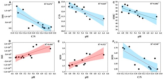 Based on the findings presented in Figure 8B–E, it was observed that soil C/N, moisture content, bacterial copy number, and ION were all closely linked to pH levels in a linear manner. Figure 8A,F also show that bacterial copy number and ION were negatively correlated with C/N. These results suggest that soil pH and C/N are important factors that impact the properties of various soil utilization types.