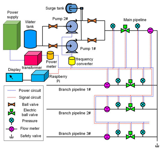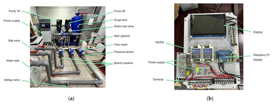 According to the above requirements, the structure of the experimental device is shown in Figure 1, which is mainly composed of executive components, monitor, and control components. The executive components include the centrifugal pump station and its frequency converter, the electric ball valve and three branch electric valves. The head pump is a vertical centrifugal pump (CDMF20-10FSWSC, South Pump Industry, Taizhou city, China), with a rated flow of 30 mh−1, head of 119 m, power of 11 kW and rotating speed of 2900 r/min. The frequency converter for controlling the pump station is ABBACS510-10. The diameter of the main pipeline is 90 mm, and the diameters of the three branch pipelines connected with the main pipeline are 75 mm. The electric ball valves (TQ911F-10S), pressure sensors (U-MIK-P300-M) and electromagnetic flow sensors (L-MABB) were installed on the main pipeline and the three branches, respectively. The monitor and control components include Raspberry Pi 4B, display screen, digital to analog conversion module (DA), RS485 data communication module, pressure and flow sensors, and the experimental device also includes a water tank, surge tank, manual ball valve, drainage valve, power supply and distribution box.