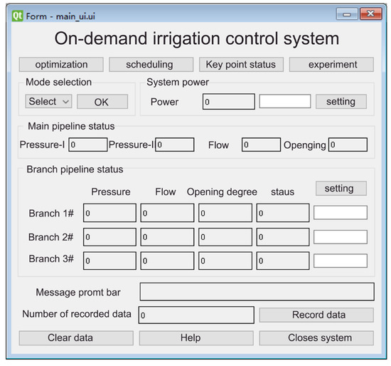 To improve the visualization and operability of control system, the Python editing language, the PyCharm integrated development environment (IDE), Qt Designer interactive visual design tool, and SSH (Secure shell) remote communication security protocol [25] were used developing an on-demand WDN control system software, as shown in Figure 2, the functions of this software are control parameters optimization, irrigation schedule, monitor the status of key nodes in pipeline, and control performance tests, respectively. Among them, the control parameters optimization was developed based on the optimized model, and the best opening degree of the electric valve can be obtained. The irrigation schedule includes water demand data for crops at different growth stages. They monitor the status of key nodes in the pipeline, which can display the data of pressure and flow in real time, as well as the opening degree of all-electric valves in the pipe network. The control performance test controls the system using the input box of the pump station impeller speed and the opening degree of electric ball valves. The software also includes the functions of querying historical data and clearing data. This software has both manual and automatic control modes.