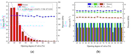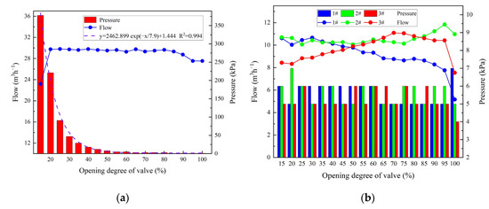 For Experiment 1, when the frequency of the pump station is fixed at 50 Hz, and the opening degree of the electric valve in the main pipeline is gradually reduced from 100% to 25%, the variation amplitude of the flow in the main pipeline is relatively small, this parameter is stable within the range of 31 mh−1 to 32 mh−1. However, when the opening degree in the main pipeline increases from 0 to 100, the pressure of the main pipeline drops sharply from 300 to 5 kPa, as shown in Figure 4a. As the opening degree of the valve further increases, the pressure in the main pipeline gradually decreases to 0. The exponential function is used to fit the pressure and flow. The results indicate that the correlation coefficient of the exponential function is 0.941. These results show that the opening degree of the electric valve in the main pipeline has little effect on the flow, but it has a significant impact on the pressure. As shown in Figure 4b, the pressure and flow of the three branch pipelines changed little during the increase of the valve opening, and the pressure and flow of the branch one pipeline and branch two pipelines were greater than the branch three pipelines, respectively.