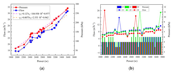 For Experiment 2, the main pipeline’s changes in pressure and flow are shown in Figure 5a. The opening degree of the electric valve in the main pipeline is set to 25%, and the power of the pump station gradually changes from 1943 W to 3301 W. The flow and pressure of the main pipeline increase with the increase of the water pump power. The pressure of the main pipeline increases from 61 kPa to 233 kPa, and the flow increases from 17.8 mh−1 to 27.3 mh−1. As the power of the pump station increase, the pressure and flow of the main pipeline show a linear increasing trend. The correlation coefficients between pressure, flow and pump power are 0.977 and 0.962, respectively. It can be seen that the power of the pump station significantly affects the pressure and flow of the main pipeline. The pressure and flow changes of the three branch pipelines are shown in Figure 5b. As the power of the pump station increases, the flow and pressure of the three branch pipelines do not change much. The pressure and flow trends of the three branch pipelines are consistent, but the flow of the three branches pipeline shows significant changes in some tests. Similar to Experiment 1, the pressure of the Branch 1 pipeline and Branch 2 pipeline is greater than that of Branch 3.