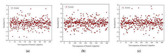The residuals of the opening degree of three branch valves between the predicted value of the XGBoost model and the true value are shown in Figure 7. For the total 408 test set and the three branches, it can be seen that the number of residuals distributed in the range of [−5, 5] % is 320, 325, and 324, respectively. The number distributed in the range of [−3, 3] % is 238, 245, and 245, respectively. The number distributed in the range of [−20, −10] % is 10, 6, and 9, and the number distributed in the range of [10, 20] % is 8, 6, and 6, respectively. These data indicate that the residual of the XGBoost model in predicting valve opening degree is mainly concentrated within the range of [−3, 3] %, and the residual distribution characteristics between the three branches are not significantly different.