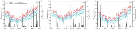 Daily maximum temperature, average temperature, minimum temperature, and precipitation during the winter wheat growing seasons of 2019–2020 (2020), 2020–2021 (2021), and 2021–2022 (2022).