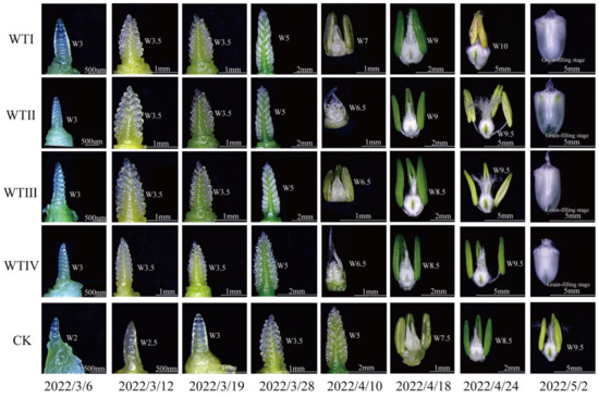 Climate warming will alter the growth and development process of wheat [8,9,10]. Studies have indicated that, for every 1 °C increases in the minimum temperature on the North China Plain, wheat regreening advances by 10.5 days [11]. Tao et al. [12] suggested that during the period from 1981 to 2018 climate warming resulted in a reduction in the duration of winter wheat growth by 4.2 days per decade. The spike differentiation stage is a critical period for the formation of wheat reproductive organs as well as a key period in determining wheat yield. The influence of spikelet differentiation on wheat yield formation is mainly achieved through the kernel number per spike [13]. Li et al. [14] conducted a study and found that winter warming advanced the single-ridge stage by 5–28 days, the double-ridge stage by 3–24 days, and the floret differentiation stage by 1–18 days. Therefore, winter warming advanced and prolonged the spike differentiation stage of wheat during the overwintering period [15]. However, the effects of periodic warming during late winter and early spring on spikelet development and morphological changes remain unclear.