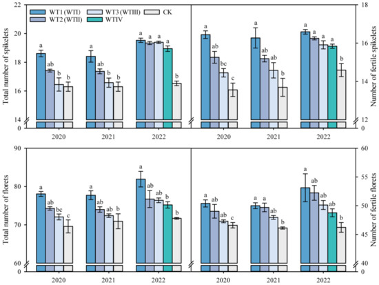 When 50% of the spring leaves of all plants in the field reached 1–2 cm in length, this was recorded as the regreening stage (regreening). When the first node was detectable, this was recorded as the stem elongation (Z31) stage. When the flag leaf sheath was extending, this was recorded as the booting (Z41) stage. When anthesis was beginning, it was recorded as the anthesis (Z61) stage. Finally, when the caryopsis was hard (difficult to divide with the thumbnail), this was recorded as the maturity (Z91) stage. [29]. Each treatment was observed using a stereomicroscope (OLYMPUS-SZX10, OLYMPUS, Tokyo Metropolis, Japan) and a digital camera (OLYMPUS-EP50, OLYMPUS, Tokyo Metropolis, Japan) for spikelet development every three days starting from 25 January 2022. The developmental characteristics of the spikelets were observed according to the criteria of Waddington et al. [30] (Table A1). The total number of florets (TNF) and the number of fertile florets (NFF) were recorded.