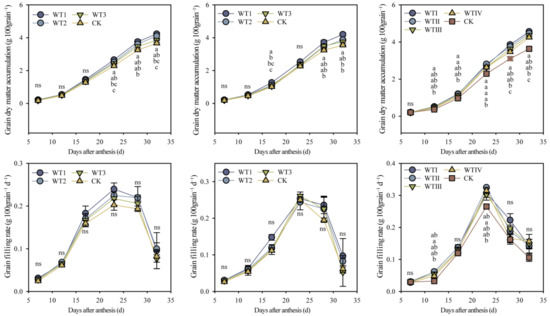 Effects of phased warming in late winter and early spring on grain dry matter accumulation and grain filling rate. Means were compared by Tukey’s test. The different letters above each bar indicate a significant difference at p < 0.05; ns means non-significant. Error bars indicate the standard error (n = 3).