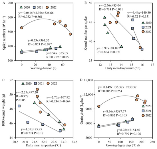 (A) Relationship between warming duration and spike number; (B) relationship between daily mean temperature (Z31–Z61) and kernel number per spike; (C) relationship between daily mean temperature (Z61–Z91) and 1000-kernel weight; (D) relationship between growing degree days and grain yield. GDD: growing degree days (the difference between the growing degree days of warming treatments and CK during the warming period).