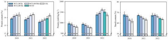 Effects of phased warming in late winter and early spring on grain protein content, protein yield, and starch content. Means were compared by Tukey’s test. The different letters above each bar indicate a significant difference at p < 0.05. Error bars indicate the standard error (n = 3).