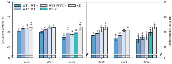 Effects of phased warming in late winter and early spring on wet gluten content and sedimentation value of grains. Means were compared by Tukey’s test. The different letters above each bar indicate a significant difference at p < 0.05. Error bars indicate the standard error (n = 3).