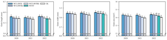 After natural air-drying of grains harvested during three growing seasons, grain protein content, wet gluten content, and sedimentation value were determined using a near-infrared grain quality analyzer (Perten-DA7250, Perten Instruments AB, Segeltorp, Sweden). Grain length, grain width, and grain area were measured using a high-speed HD doc scanner (S500A3B, Eloam, China). Dried grain samples were ground and sieved through a 40-mesh sieve to obtain the test sample. The starch content of the grain was determined using an anthrone colorimetric method [31]. Specifically, 50 mg of dried powder was placed in a centrifuge tube with 10 mL of 3 mol/L HCl and heated in a 100 °C water bath for 45 min. After cooling to room temperature, the liquid and residue were transferred to a 50 mL volumetric flask and 8 mL of 3 mol/L NaOH was added before filling with distilled water. A diluted test solution of 200 μL was taken and mixed with 800 μL of 0.2% anthrone (prepared with 98% H2SO4) and shaken. The mixture was heated in a 100 °C water bath for 5 min, cooled, and the absorbance was measured at 620 nm using a microplate reader (Epoch 2 Microplate Spectrophotometer, Bio Tek Corporation, Winooski, VT, USA).