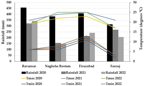 Annual rainfall (mm), maximum and minimum temperatures (degrees °C) at the four locations where the trials were conducted for three years (from Iran Meteorological Organization https://irimo.ir/ accessed on 15 April 2023).