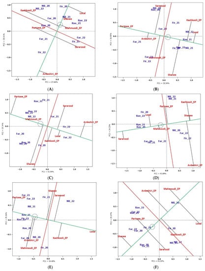 In the case of grain yield (Figure 2A), the most stable entries were two EPs, namely Mahmoudi_EP and Ardeshiri_EP and the landrace Shanee, while the least stable were Kashkooli_EP, the improved variety Sararood-1 and Partoee_EP. The local landrace from Kermanshah (local) was intermediate. It is worth noticing that none of the entries yielded consistently (poor or good) in all the three years in the same location as indicated by the position of the entry labels relative to the environment (combination of location and year) labels. For example, Shanee, the local, Mahmoudi_EP and Sararood-1 yielded more than the average in Ravansar (Rav) in 2021 and 2022, but less than the average in the same location in 2020. Similarly, Kashkooli_EP and Partoee_EP yielded more than the average in Farouj in 2020 and 2021, but less than the average in the same location in 2022.
