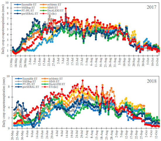 Maize seasonal evapotranspiration varied from 589.7 to 683.2 mm and averaged 634.9 mm for the 2017–2022 period (Table 6). The highest seasonal evapotranspiration was obtained in 2020 and the lowest seasonal evapotranspiration was obtained in 2022. OpenET models eeMETRIC, SSEBop, SIMS, PT-JPL, DisALEXI, and geeSEBAL showed smaller maize seasonal evapotranspiration values, by 2.4, 12.7, 7.9, 25.1, 13.9 and 10.8%, respectively. eeMETRIC compares most similarly to the ETc(kc) model, followed by SIMS. These two could be used as alternative sources of maize evapotranspiration for appropriate management in the study area. Maize evapotranspiration for the same research site varied from 634.2 to 697.7 mm, and averaged 665.3 mm, for the 2011–2017 period [42]. Basso and Ritchie [73] reported maize seasonal evapotranspiration values of 640 mm under an arid climate in Arizona. In Nebraska, the fully irrigated maize seasonal evapotranspiration was 620 and 634 mm in 2009 and 2010, respectively [74]. Similar results were obtained by Trout and DeJonge [75] under a semiarid climate in Colorado. In contrast, much higher maize seasonal evapotranspiration (up to 685 mm) in New Mexico has been reported [76], as well as 818 mm [77,78] and 973 mm [79,80] in Texas. While different magnitudes of maize evapotranspiration were reported, the differences might have been due to climatic conditions, the specific evapotranspiration estimation methods, maize hybrids, management practices and other factors.