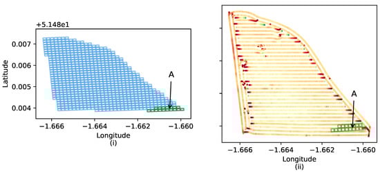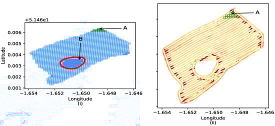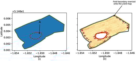 Figure 4 illustrates the importance of restricting yield map interpolation to the limits of the field, as shown by the green boundary line. Without such restriction, interpolation would continue indefinitely beyond the field boundary. When dealing with yield maps that contain voids, however, an additional inner boundary exists (artefact A) that is not accounted for in the original boundary file. As a result, interpolation will continue until the void is filled. This can significantly impact the accuracy of interpolation methods and downstream processes, such as yield prediction, that rely on such data. Therefore, it is crucial to identify yield maps with voids and reconstruct the boundary files to reflect these physical features.
