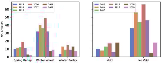 Figure 7 summarises the dataset with the distribution of crops across fields for each year and the void distribution across fields.