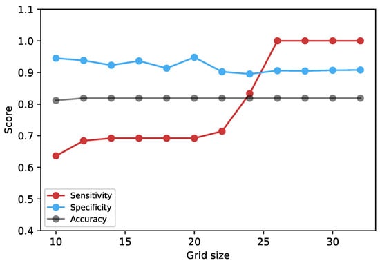 Figure 8 shows the results of the classification algorithm. This is a binary classification problem with yield maps with voids given as positive examples and those without voids considered as negative examples. Yield maps usually contain other kinds of gaps, for example harvest lines (gap between two harvest line) and other anomalies which are not voids, and should not be misclassified as such. Choosing an optimal grid size is important to avoid false positives. Typically the gap between two harvest lines is usually about 10 m. For this reason grid size values below 10 m were not used to avoid this miss identification. Grid sizes above 25 m had the highest score of 100%, 91%, and 82% for sensitivity, specificity, and accuracy, respectively. The main objective of the experiment was to minimise false positives, as this would affect downstream processes. These are defined as below: