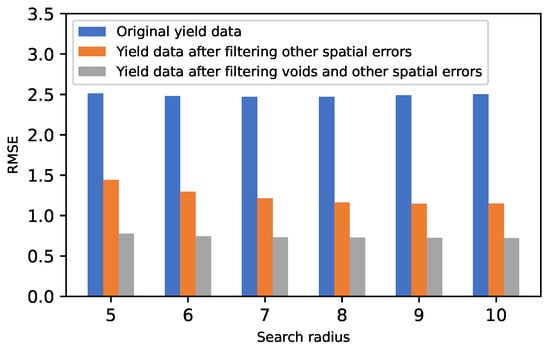 14]. The presence, or lack, of spatial errors leads to a deterministic change in quality evaluation metrics and RMSE. This relationship can be used to determine a quality score for the data, which can be used to assess the trustworthiness of the yield datasets and how much credence the data should be used for decision-making.