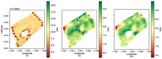 Figure 10ii (artefact A) demonstrates that conventional approaches that do not account for voids and other spatial errors can result in inaccuracies. This can compromise downstream processes such as yield prediction that rely on this data. Additionally, the interpolation process can also impact regions outside of the void, leading to incorrect yield representations and potentially erroneous decision-making, such as in the case of automated fertilizer applications. On the other hand,