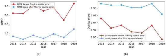 Figure 11a,b illustrates the yield data’s average RMSE and quality score for different years, both before and after filtering out spatial errors. Pearson’s correlation coefficient was used to analyse the relationship between the RMSE and the quality score. The comparison was made between the RMSE values before and after filtering and their respective quality scores. An inverse relationship was observed between the RMSE and the proposed quality score. This behaviour is expected since, as the yield data quality improves, the RMSE is anticipated to decrease while the quality score would increase, and vice versa.