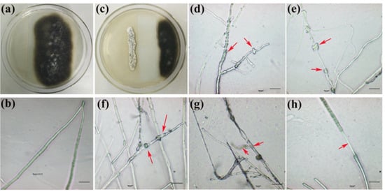Confrontation culture of Alternaria alternate with blank (a,b) or Streptomyces hygroscopicus JY-22 (c–h). (a,c) display the antagonistic activity of JY-22 against Alternaria alternata after co-culture on PDA plates. (b,d–h) show the mycelial features of Alternaria alternata after confrontation culture with blank and JY-22. Red arrows in (d–h) show the malformations of hyphae, including swelling (d–f), twist (e), collapse (g) and thinning (h). The scale bar is 12 μm.