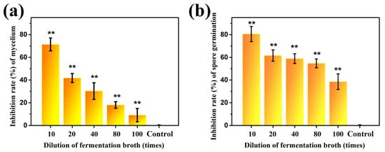 In addition, A. alternata was inoculated on PDA agar plates with different concentrations of JY-22 culture filtrate (diluted 10, 20, 40, 80 and 100 times), and the mycelial inhibition rate of each group was investigated by measuring the colony diameter of each group and its control group. Notably, compared to the control, the growth of the pathogen colonies was markedly dependent on the concentration of JY-22 culture filtrate (Figure 2a). At 10-times dilution, JY-22 culture filtrate exhibited the highest degree of bio-control on A. alternata, with a 71.39% inhibition rate. In contrast, the dilution effects of 20-, 40-, 80- and 100-times concentrations were relatively weaker, 41.79%, 30.31%, 18.01 and 9.10%, respectively.