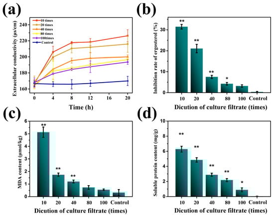 Effects of JY-22 culture filtrate on (a) extracellular conductivity, (b) inhibition rate of ergosterol content, (c) MDA content and (d) soluble protein content of Alternaria alternata. SE of three biological replicates. Statistical analysis of data was performed based on one-way ANOVA for samples from multiple treatments. The p-values are indicated by stars, *: p < 0.05, **: p < 0.001.