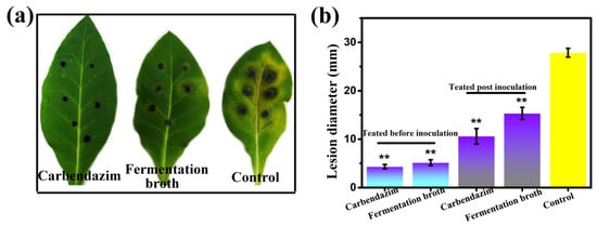 Lesion diameter development 7 days post-inoculation with JY-22 culture filtrate following preventative and curative treatments in vivo. (a) Phenotypic images of the preventative effect of JY-22 culture filtrate against A. alternata in vivo; (b) lesion length following preventative and therapeutic treatments. SE of three biological replicates. Statistical analysis of data was performed based on one-way ANOVA for samples from multiple treatments. The p-values are indicated by stars, **: p < 0.001.