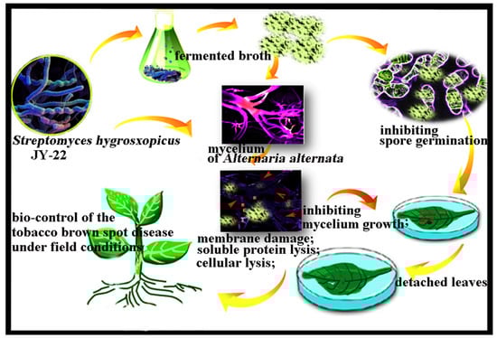 Schematic representation of application of Streptomyces hygroscopicus JY-22 to control tobacco brown spot caused by A. alternata.