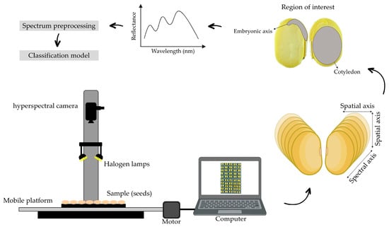 However, the use of other complementary techniques that allow for accurate seed evaluations provides greater assurance in decision making. Hyperspectral imaging (HSI) provides a dataset (hypercube) that comprises hundreds of spectra distributed over the analyzed area [10]. Spectral information can be used in the rapid assessment of seed quality by integrating spectral and spatial information, assisting in capturing structural or chemical composition changes [11]. Spatial and spectral processing of HSI must be used to minimize the effect of factors affecting spectral measurement. Spatial processing is associated with the selection of the region of interest (ROI) to be analyzed. For example, a soybean seed may have as its ROI the region of the embryonic axis and cotyledons. Meanwhile, spectral processing aims to avoid the influence of undesirable factors. These factors can be due to light scattering, particle size effects, differences in morphology, porosity, roughness and detectors [12].