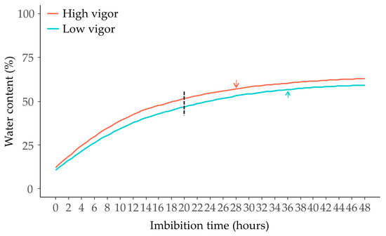 The soaking curve was determined using four repetitions of 50 seeds per lot. Initially the water content of the seeds was determined; then, the repetitions of each lot were weighed on a scale with a precision of 0.0001 g and distributed on paper towels, moistened with water equivalent to 2.5 times the dry mass of the paper, and kept in a germinator regulated at 25 °C in the absence of light [20]. To calculate the water content throughout the soaking process, the seeds were removed from the paper towel roll and weighed at one-hour intervals for 48 h. The criterion for germination was the protrusion of the primary root (≥2 mm) of 50% of the seeds of each lot. The results are expressed as a percentage of water content, were calculated using Equation (1) and were used to plot the soaking curve for each batch.