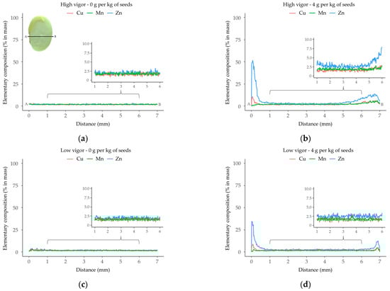 The results of the scanned line analyzed using μ-XRF technique in the region of the seed coat, the periphery of the cotyledon, the center of the cotyledon and the hilum in seeds soaked for 20 h without micronutrient treatment (0 g per kg of seeds) and with micronutrient treatment (4 g per kg of seeds) in high-vigor seed lots (Figure 6a,b) and low-vigor seed lots (Figure 6c,d) can be explained based on the seed hydration process. When analyzing the scanned line for the dose of 0 g per kg of seeds, a low concentration (mass %) of the target elements (Cu, Mn and Zn) was observed for both lots (Figure 6a,c), confirming the findings from the XRF analysis in Figure 5a. When the seeds were treated with the dose recommended by the manufacturer (4 g per kg of seeds), it was observed for both lots that the hilum and seed coat regions exhibited the highest percentages of the elements, respectively. These results indicate that only a small amount of the elements applied through seed treatment were transferred to the interior of the cotyledons during the imbibition process. The comparative analysis of the percentage graphs of Cu, Mn and Zn for the dose of 4 g per kg of seeds (Figure 6a,d) reveals that there was no difference between the high- and low-vigor lots, as also observed in the XRF analyses (Figure 5b).