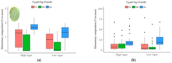 The investigation of the percentage of the microelements Cu, Mn and Zn at the analyzed points in the embryonic axis of soaked seeds without micronutrient treatment (0 g per kg of seeds) revealed low concentrations, with Zn being the microelement with the highest percentage in both lots (Figure 7a). After treatment with micronutrients at a dose of 4 g per kg of seeds, a small increase in Cu, Mn and Zn was observed in both the high- and low-vigor lots (Figure 7b). The presence of outliers was observed when the seeds received treatment. The data also revealed higher maximum values (longer tails) for the concentrations of Zn in the embryonic axis of seeds from the low-vigor lot when the dose of 4 g per kg of seeds was applied. The observed response for Zn can be attributed to its higher concentration in the product used for seed treatment (15.1%). It is worth noting that the concentration of Zn, Mn and Cu in the embryonic axis was very low in seeds from both lots when compared to the concentrations measured in the seed coat (Figure 6b,d).