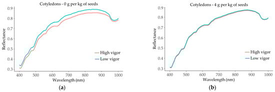 The average spectral curves of the raw data corresponding to micronutrient doses of 0 and 4 g per kg of seeds from the cotyledon region (Figure 8a,b) and embryonic axis (Figure 8c,d) of the high- and low-vigor lots are displayed below, respectively. The cotyledon region and embryonic axis of the seeds from the low-vigor lot that were not treated with micronutrients (0 g per kg of seeds) exhibited higher reflectance (Figure 8a,c) in the visible (400–700 nm) and near-infrared (700–940 nm) regions. In the cotyledon region and embryonic axis of seeds treated with the dose of 4 g per kg of seeds, no difference in reflectance was observed between the high- and low-vigor lots. The relationship between seed vigor and reflectance of the internal region of soybean seeds is not yet well-established in the context of seed physiology. However, it has been observed that less vigorous seeds, regardless of the analyzed region, exhibit higher reflectance in the near-infrared range (700–940 nm). This suggests that the reflectance properties of the internal region may be influenced by seed vigor, particularly due to the seeds’ water content (Figure 4).