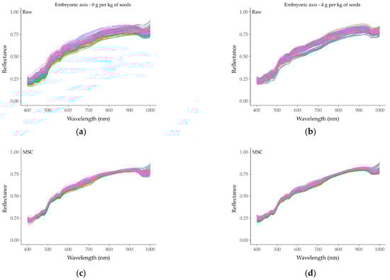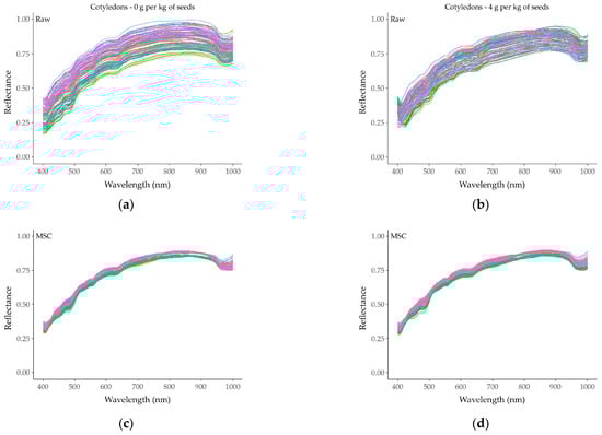 The raw spectral information of the cotyledon region of untreated (0 g per kg of seeds) and micronutrient-treated (4 g per kg of seeds) soybean seeds from the high- and low-vigor lots is shown in Figure 9a,b, respectively. The applied preprocessing techniques, MSC and SNV, can be observed in Figure 9c–f, respectively. The comparison of the raw and processed spectral profiles of the cotyledon region in soybean seeds from the high- and low-vigor lots shows that the applied processing methods have reduced spectral noise, resulting in smoother spectral curves. By analyzing the entire studied range (400–1000 nm), it can be observed that the spectral trends after processing using the MSC and SNV methods were similar in the cotyledon region of both untreated (0 g per kg of seeds) and micronutrient-treated (4 g per kg of seeds) seeds from the high- and low-vigor lots.