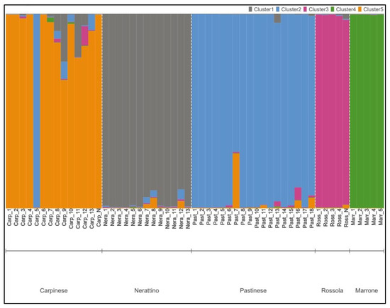 The population structure of 55 C. sativa accessions was determined using the STRUCTURE 2.3.4 software [69]. The optimal number of populations detected was five, according to the ΔK of the Evanno method [70], which showed a sharp peak at K = 5 (Figure S1). The result almost confirmed the varietal correspondence, as indicated by the local farmers. In this context, the STRUCTURE analysis was able to identify the five considered varieties: Nerattino, Pastinese, Rossola, Carpinese, and Marrone (Figure 1). Indeed, the first cluster was composed of all Nerattino accessions, which showed a coefficient of membership greater than 0.90. In addition, all Pastinese samples were gathered in the second arrangement, with a high coefficient of membership (~greater than 0.88), except for Past_7, which revealed an association equal to 0.70. Surprisingly, Carp_5, which was previously established as Carpinese, exhibited a genetic fingerprinting similar to Pastinese, being clustered with the second group. Moreover, the third group comprised all the Rossola specimens (membership coefficient >0.95) collected in the Pistoia area (Ross_1, Ross_2, Ross_3, and Ross_4), as well as the sample originated from a local nursery (Ross_N). The fourth cluster was composed of all Marrone outgroups, while the fifth group consisted of all Carpinese accessions with a membership greater than 0.65.