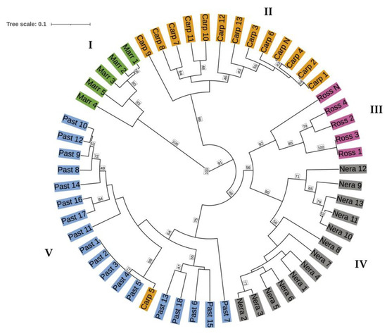 The result obtained by a Bayesian approach was confirmed using a clustering analysis based on the genetic distances among the 55 C. sativa specimens, as revealed by the UPGMA dendrogram generated in accordance with Bruvo’s genetic distances (Figure 2). The overall average genetic distance was equal to 0.166, ranging from 0.000 (observed in the pairs Carp_1 and Carp_2, Carp_4 and Carp_N, Ross_3, and Ross_1, as well as the group Past_2, Past_3, Past_4, Past_5) to 0.823, as was noticed between Marr_4 and Past_10. The UPGMA dendrogram showed the same clustering for STRUCTURE. The first cluster (I) was composed of all Marrone accessions, which resulted in being the most distant group in the considered population. Otherwise, the four other groups comprised the chestnut ecotypes. Particularly, the second arrangement (II) included all Carpinese specimens except for Carp_5, which was also clustered in the dendrogram with all Pastinese samples (V), even though it was recognized. The other two groups (III and IV) consisted of all Rossola and Nerattino accessions, respectively. The cophenetic correlation coefficient was equal to 0.95, confirming the robust consistency and reliability of the dendrogram.