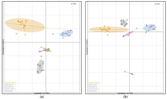 Another clustering analysis was achieved using principal co-ordinates analysis (PCoA) according to Jaccard distances, as shown in Figure 3. Figure 3a reveals the plot between the first two co-ordinates, while Figure 3b displays the representation between Co-ordinate 1 and Co-ordinate 3. The first three co-ordinates explained 21.18%, 18.30%, and 13.04% of the total variation, respectively, describing 52.52% of the whole variance together. When considering both plots, PCoA evidently separated the 55 C. sativa into five distinct groups, confirming the results previously observed, as well as the assignment performed by the local farmers. The first two co-ordinates distinguished the Carpinese, Pastinese, and Nerattino varieties, located at the top left, top right, and middle bottom left of the plot, respectively (Figure 3a). In addition, the Carp_5 accession was grouped with the Pastinese cultivars, as was already noticed in the STRUCTURE and UPGMA dendrogram. Otherwise, Marrone and Rossola were not clearly separated by the first two co-ordinates, overlapping in the plot’s center. The segregation of Rossola and Marrone can be observed in Figure 3b, displaying the first and third co-ordinates. Indeed, Marrone was located at the bottom of the plot, evidencing the greatest distance among the groupings, while the other four groups were found around the center of the figure.