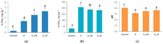 Active transformation of N-NH4+ into nitrates by nitrifying microorganisms resulted in a decrease in soil pH by 0.2–0.5 units in all treatments with urea compared to control (Figure 1c). This effect was most clearly manifested in the treatment with conventional urea, while the use of U_HA and especially U_UI contributed to a lower increase in soil acidity.