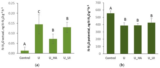 Effect of urea fertilizers on actual (a) and potential (b) N2O emission rates. Abbreviations: control soil (Control), soil treated with conventional urea (U), humate-coated urea (U_HA), conventional urea with urease inhibitor (U_UI). Values are given as mean ± SD. Different letters indicate statistically significant differences between treatments (p < 0.05) according to the LSD test.