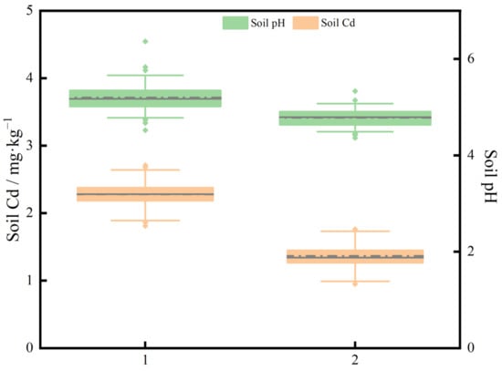 Comparison of pH value and Cd content of soil samples at the maturity stage of test site (1) and test site (2). Note: The bottom, middle line, middle dashed line, and top of the box in the box plot represent the lower quartile, median, mean, and upper quartile, respectively. The upper and lower edges (short horizontal lines) represent the maximum and minimum values within the 1.5 IQR range. Solid dots represent outliers beyond the 1.5 IQR range.
