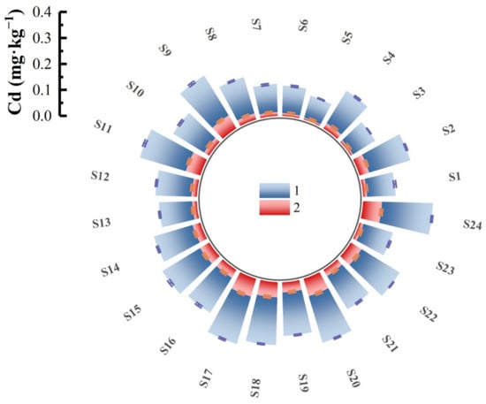 The rapid development of industrial and agricultural production has led to an increase in the content of toxic and harmful heavy metals in farmland soil worldwide [1]. Approximately 23.5 million hectares of cultivated land are polluted by heavy metals [2], including 280,000 hectares of agricultural soil in China that are polluted by cadmium (Cd) [3]. Cd is considered one of the most dangerous substances globally due to its strong migration and transformation characteristics in the environment and its high hazard to human health. In China, 7.0% of soil exceeds the Cd standard, with 0.5% of sites heavily polluted by Cd [4]. Unreasonable discharge of mine and factory sewage, sedimentation from industrial waste gas and automobile exhaust, and unscientific application of pesticides and fertilizers have all contributed to China’s soil heavy metal pollution problem, posing a serious threat to agricultural product safety and human health [5,6].