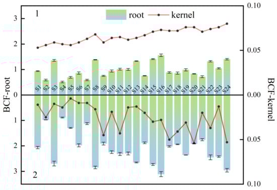 Maize roots absorb Cd from the soil and transfer it to the kernels, which is then transmitted to humans through the food chain, posing a serious threat to human health. The BCF is used to evaluate the enrichment of heavy metals in soil by plants. In this study, the enrichment coefficients of roots and kernels of different maize varieties are shown in Figure 4. It can be seen from the figure that there are significant differences in the absorption and accumulation of Cd by roots and kernels of different maize varieties.