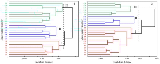 Systematic cluster analysis of Cd enrichment coefficients of different maize varieties in test site (1) and test site (2). The Roman numerals I, II, III indicate the ranking of maize kernels’ absorption capacity for Cd from low to high.
