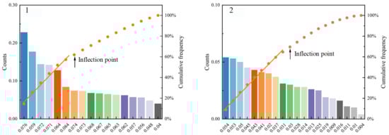 Pareto analysis of Cd enrichment coefficients of different maize varieties in test site (1) and test site (2). Note: The orange circle represents the cumulative frequency, and the inflection point indicates the boundary between high and low Cd accumulation varieties; the leftmost 20% of bars represent varieties responsible for 80% of total Cd accumulation.