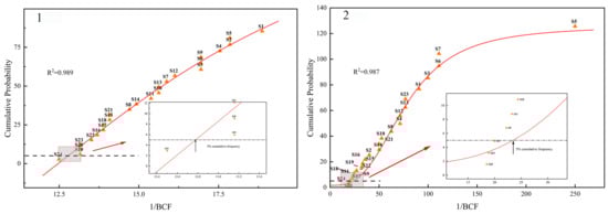 In the equation, x represents 1/BCF, y represents the cumulative probability of the corresponding crop sample, and a, b, c, and x0 are constants.