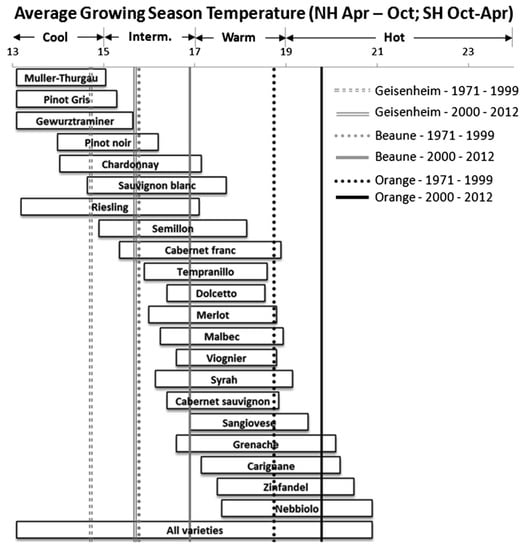 Average growing season temperature from 1971 to 1999 and from 2000 to 2012 in Rheingau, Germany (Geisenheim station, Deutscher Wetterdienst); Burgundy, France (Beaune station); and Rhone Valley, France (Orange station)—according to van Leeuwen et al. (2013) [15].