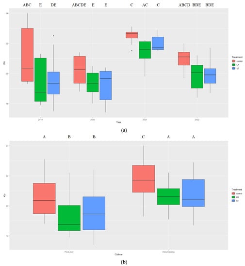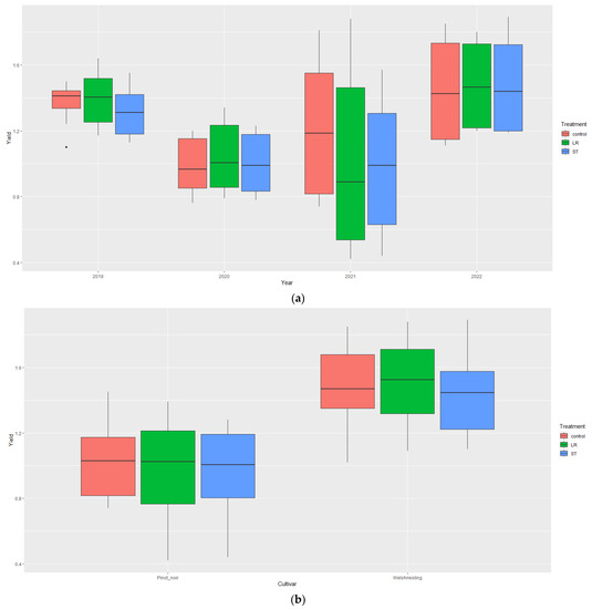 The highest yield was measured in 2022 (1.47 kg/m2) and the lowest in 2020 (1.01 kg/m2). On average, over four years, Welschriesling yielded one and a half times more than Pinot noir (1.47 and 0.99 kg/m2, respectively). The ART–ANOVA analysis showed that while there were no significant differences between treatments in terms of the yield, there were significant differences between years (Figure 5a) and cultivars (Figure 5b).