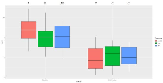 The effect of treatments on the pH was significant at the 95% level (alpha = 0.05). Although the effect of neither treatment was significant compared to the control, the two treatments, namely short topping (ST) and leaf removal (LR), were significantly different, the first giving a lower and the second a higher value (Figure 8).