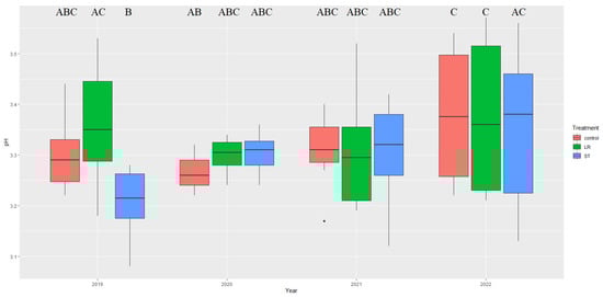 Effect of different treatments (LF = Leaf Removal; ST = Short Topping) on the pH of the grape juice in different years. Different capital letter indicate a statistically significant difference.
